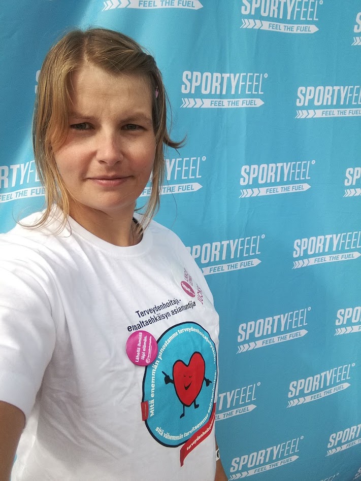Meillä piti olla portilla lunastamassa tapahtumarannekkeita klo 11 eli ennen lenkkiä jäi pari tuntia luppoaikaa. Meillä piti alunperin olla useampikin opiskelija mukana, mutta tapahtumapäivänä loputkin opiskelijat oli peruneet tulonsa, joten terkkaritiimiin jäi sitten enemmän vanhempaa väkeä. Hyvin oli kyllä tapahtuman oheisohjelmaa järjestetty ja ihan ensimmäisenä kävin kehonkoostumusmittauksessa. Jahka saan kaivettua vanhat tulokset esille, niin katsotaan, ruodinko niitä enemmän täällä bloginkin puolella jossain välissä... Tapahtumassa oli monenlaista liikunta- ja hyvinvointialan markkinoijaa. Ehtipä siinä käydä myös pikahuulimeikissä ja omat kynnet lakkaamassa juoksukuntoon (eipä olekaan taas aikoihin ehtinyt sitäkään tekemään). Juoksun jälkeen ostin vielä yhdet hyvät urheilurintsikat, kun koko ja hinta sattuivat kerrankin sopimaan yhteen.